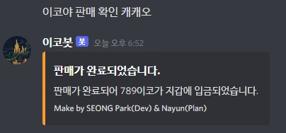 if (message.content === '이코야 구매 확인 캐캐오') {